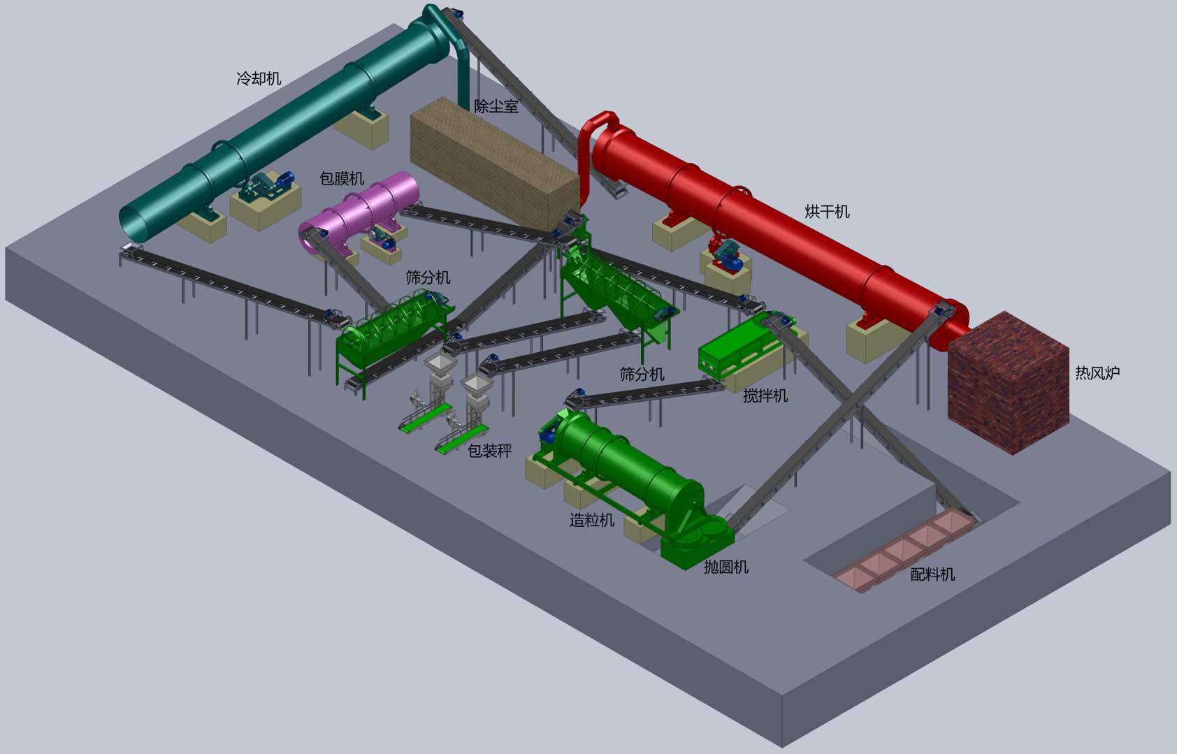 烘干后的顆粒再通過輸送帶抵達(dá)冷卻筒進(jìn)行冷卻.
